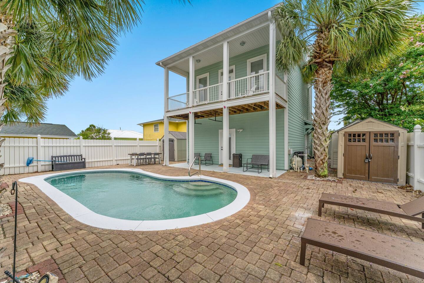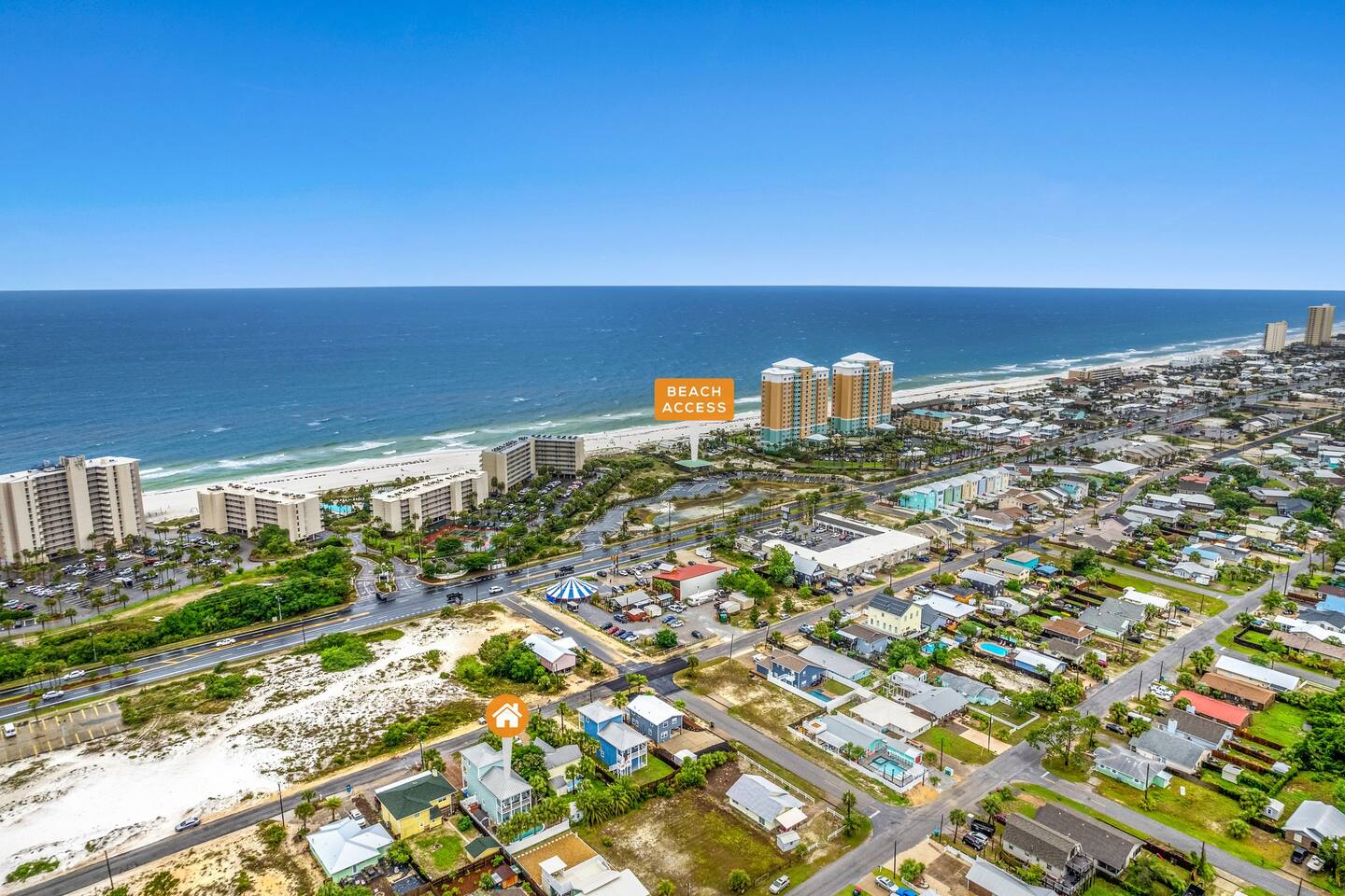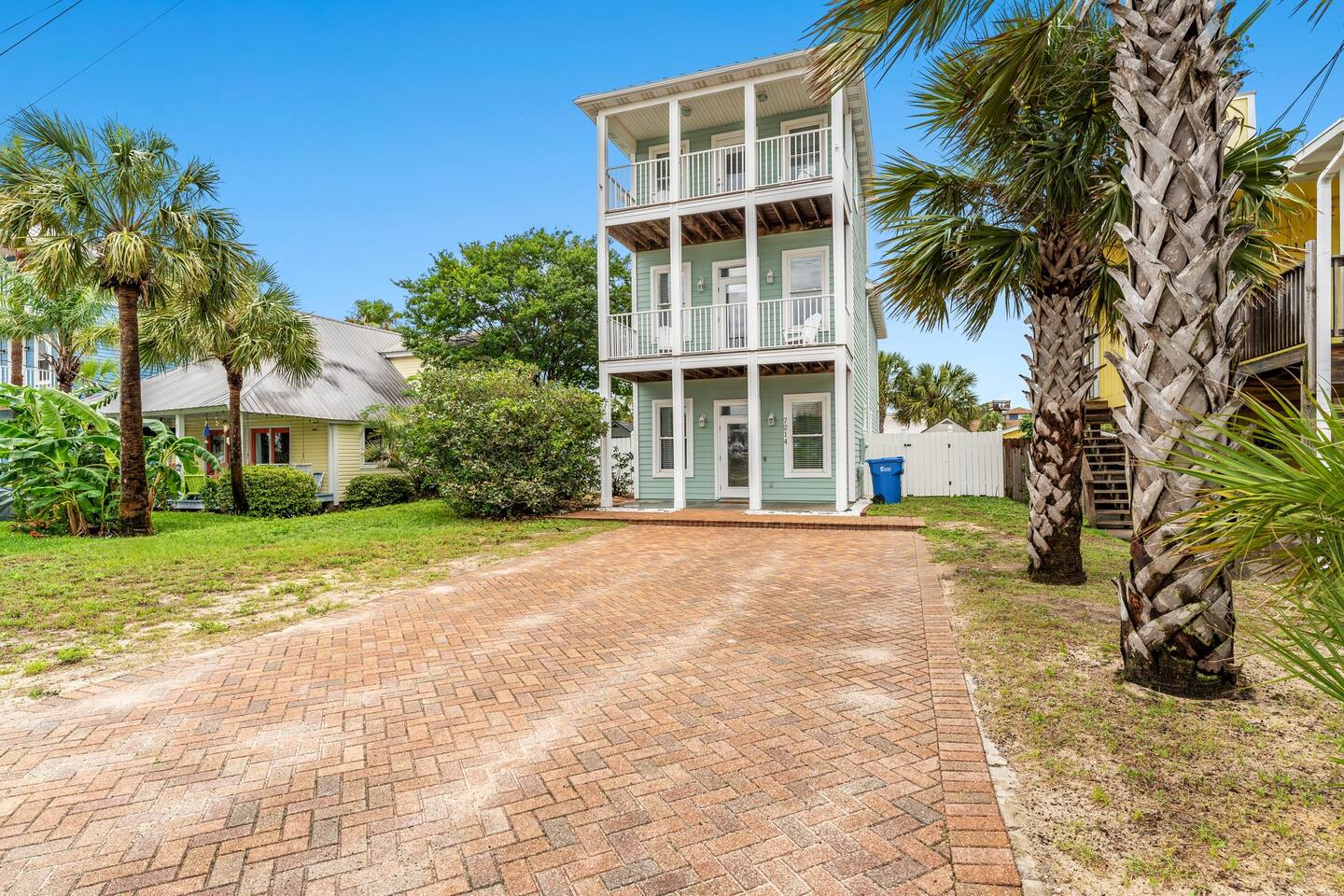 Only steps from the white sands & beautiful emerald waters of the Gulf of Mexico! Spacious decks from all bedrooms and on 2nd & 3rd floors, great for relaxing or watching the sunset! 3rd floor game-room with patio & gulf view. Very spacious bedrooms, with 3 of the bedrooms having their own en-suite dual sink spacious bathrooms. Each of these 3 bedrooms have a smart tv and a queen bed and the largest bedroom on 2nd floor also has a twin over twin bunk bed. The 3rd floor has a triple bunk bed (1 full & 2 twins), half bath, & board games/foosball table/etc. and has a beautiful view of the gulf. Watch the fireworks, sunset or sunrise from the balconies over the most beautiful beaches in the world! Leave your beach toys at home as we have plenty of extra beach chairs, umbrellas, sand toys, wagon to haul items to the beach, pool rafts/tubes, volleyball net, a pool/beach cooler, games, etc. in our guest accessible storage sheds. We provide a starter pack of basic supplies & consumables (toilet paper, paper towels, trash bags, dishwasher detergent, dish soap, shampoo, conditioner, soap, etc.) so you may need to bring or purchase additional supplies, based on the length of your stay. The Blue Crab is a 4 minute walk to the nearest public beach access point, Rick Seltzer Park, which has public restrooms & outdoor showers.